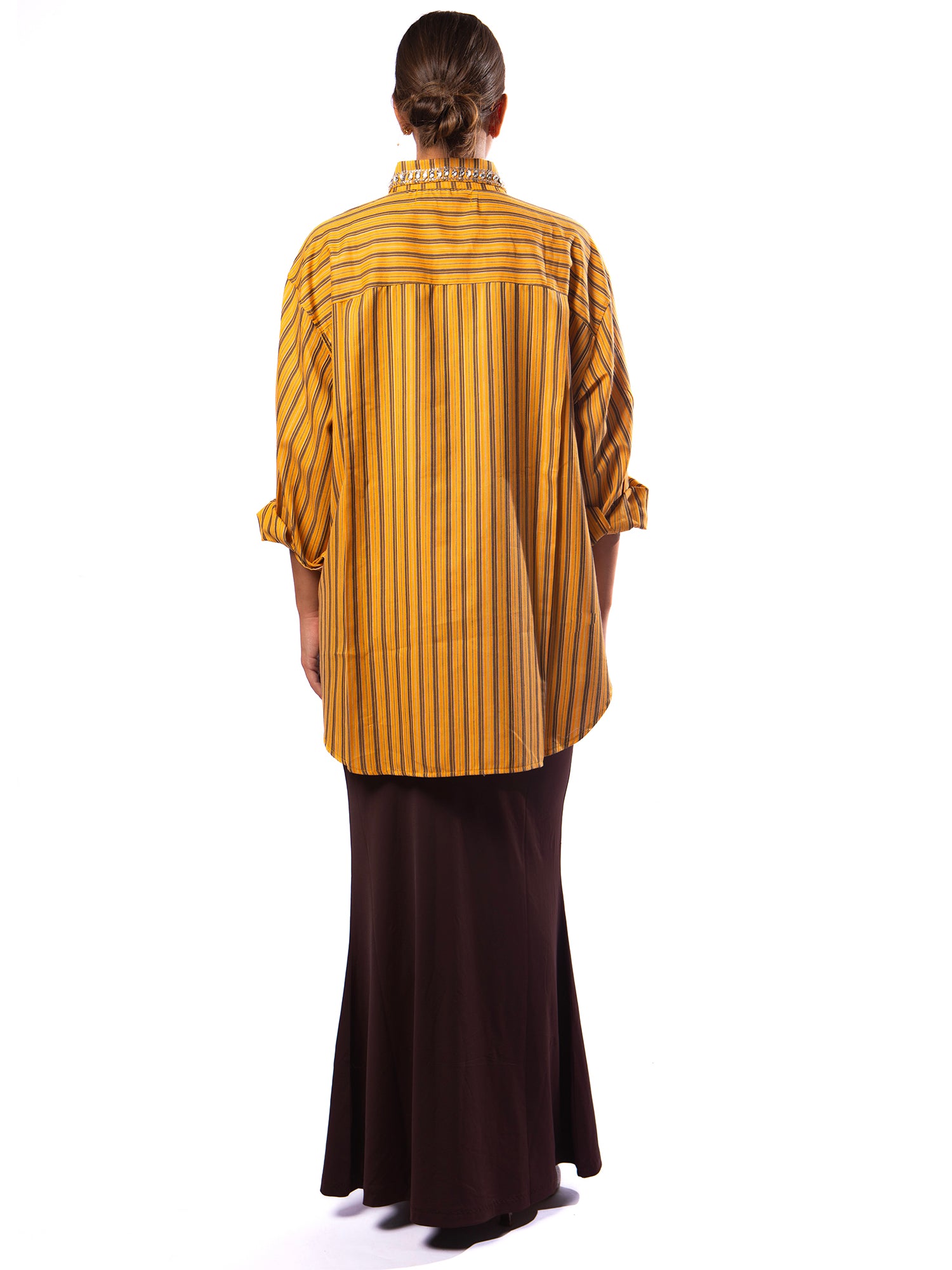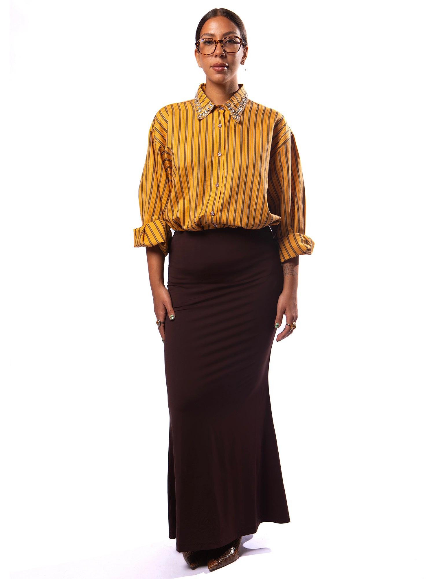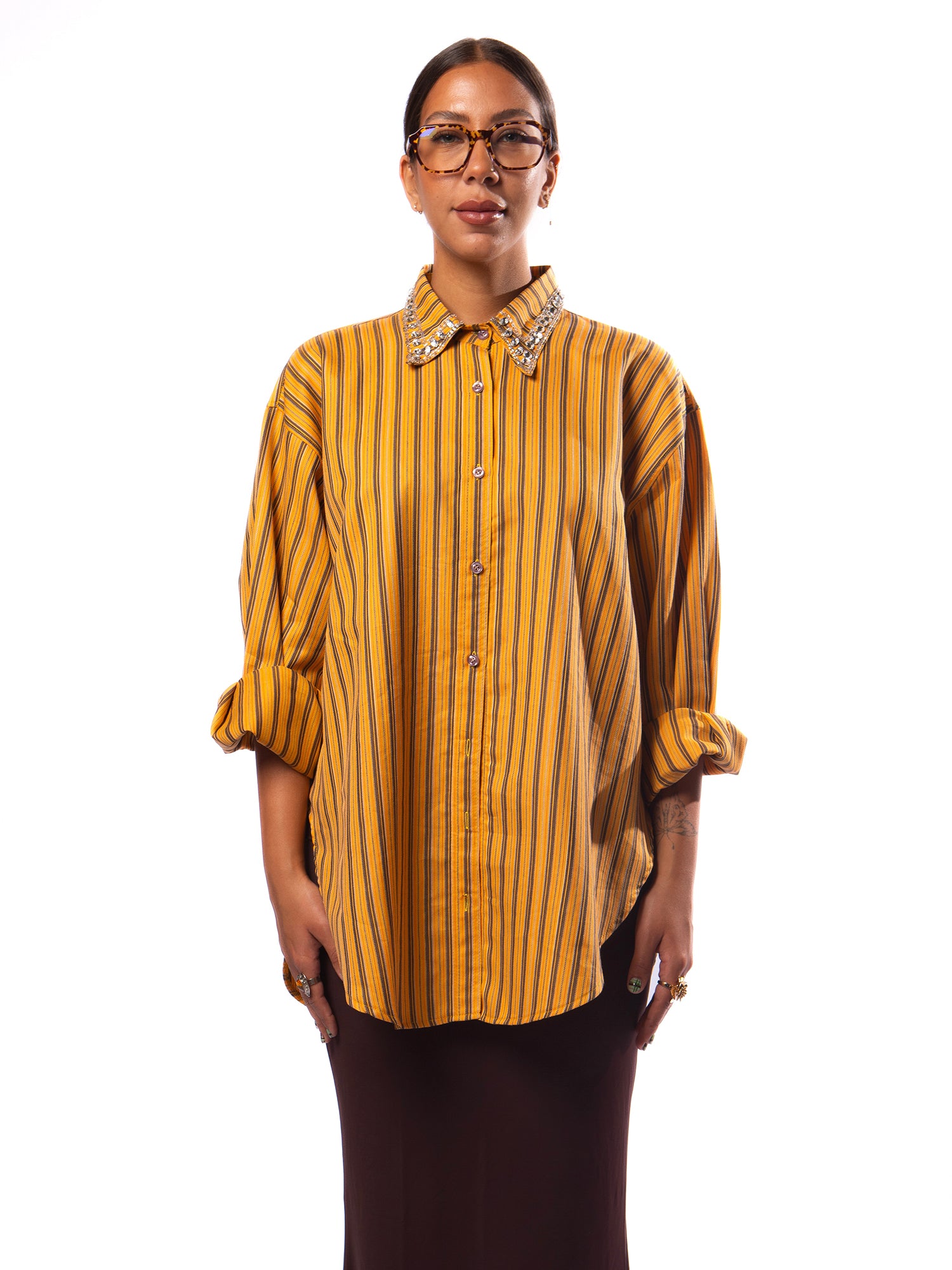 The standout detail? A delicately embroidered collar adorned with hand-placed gems and beads, adding just the right touch of sparkle for those after-hours moments.