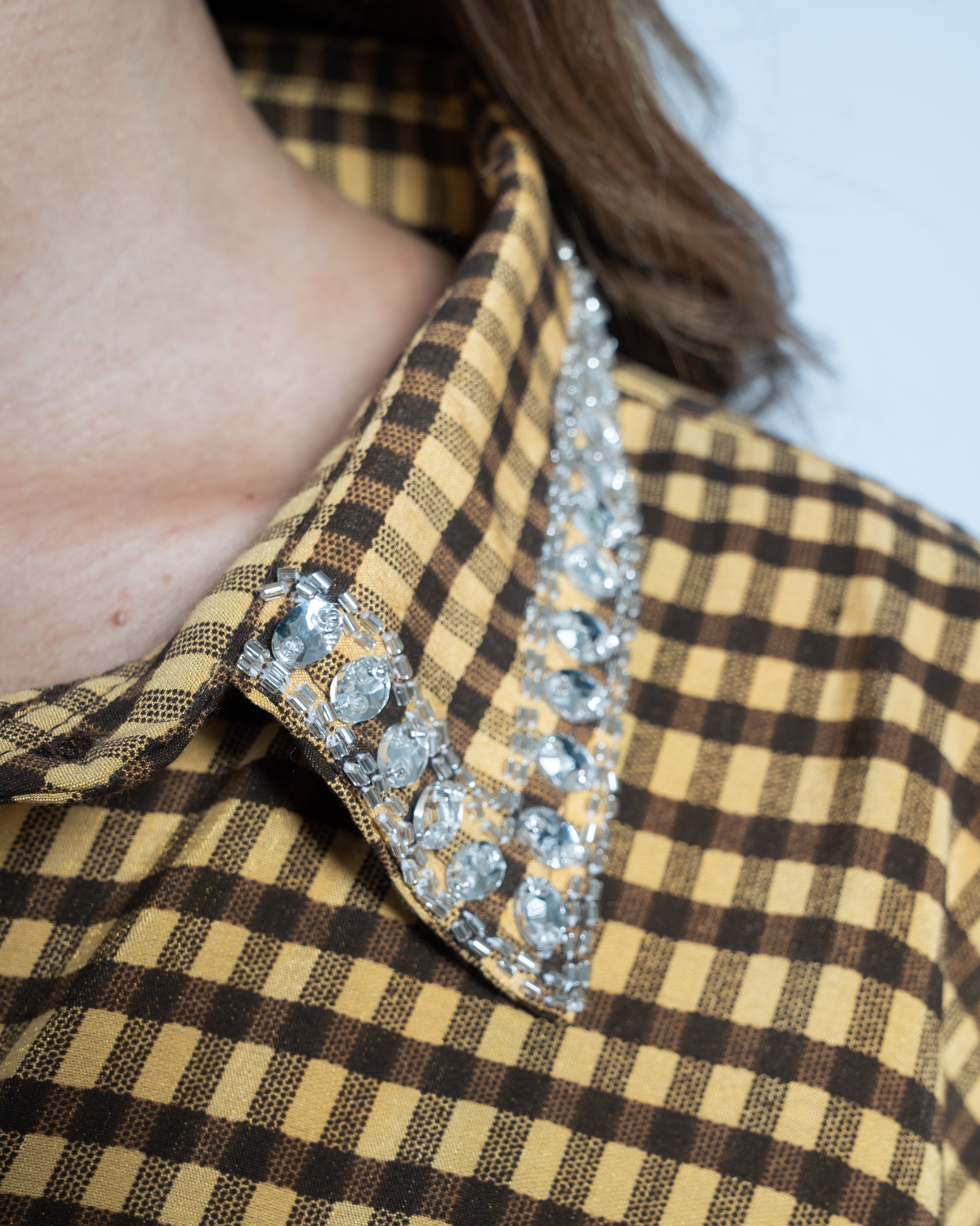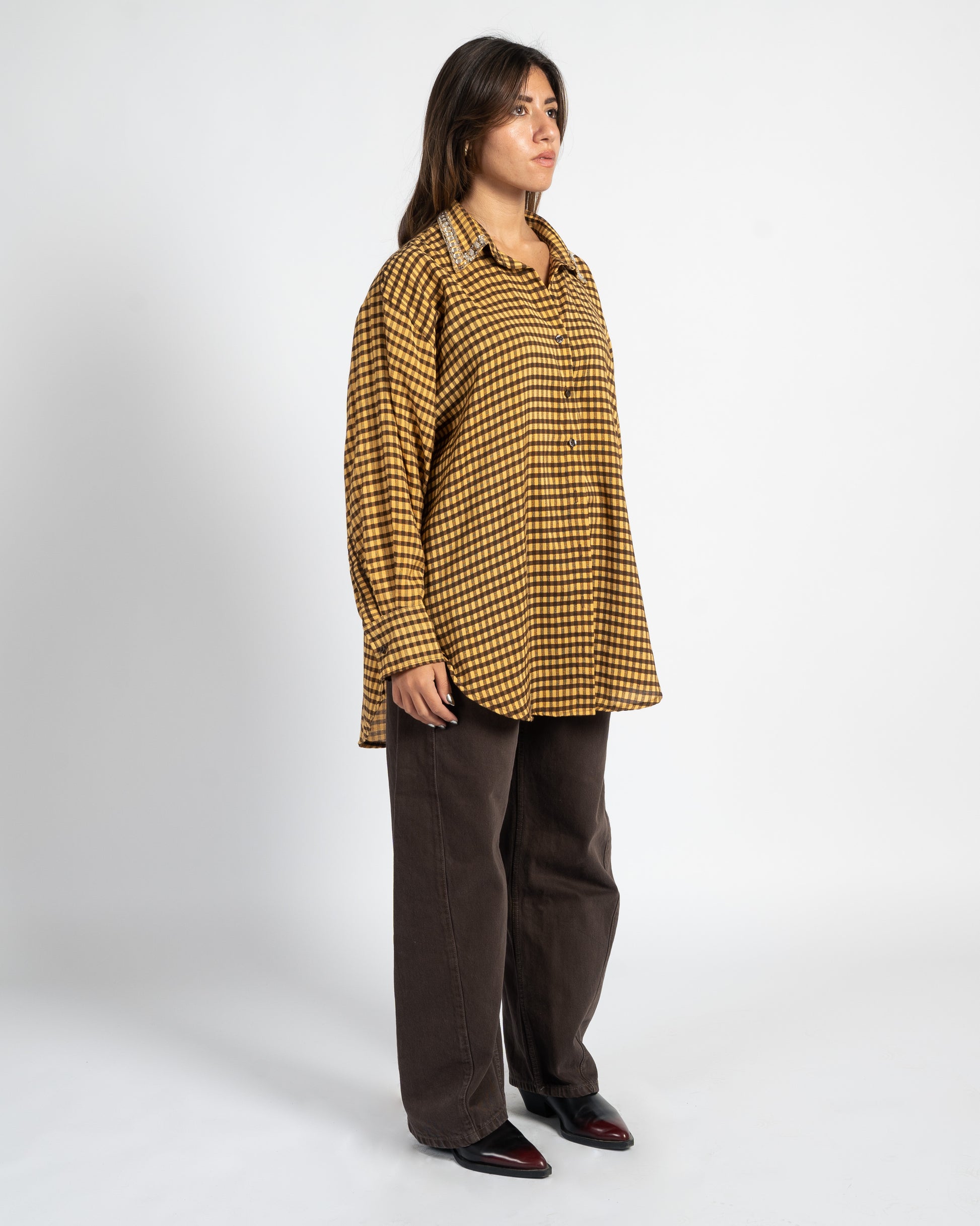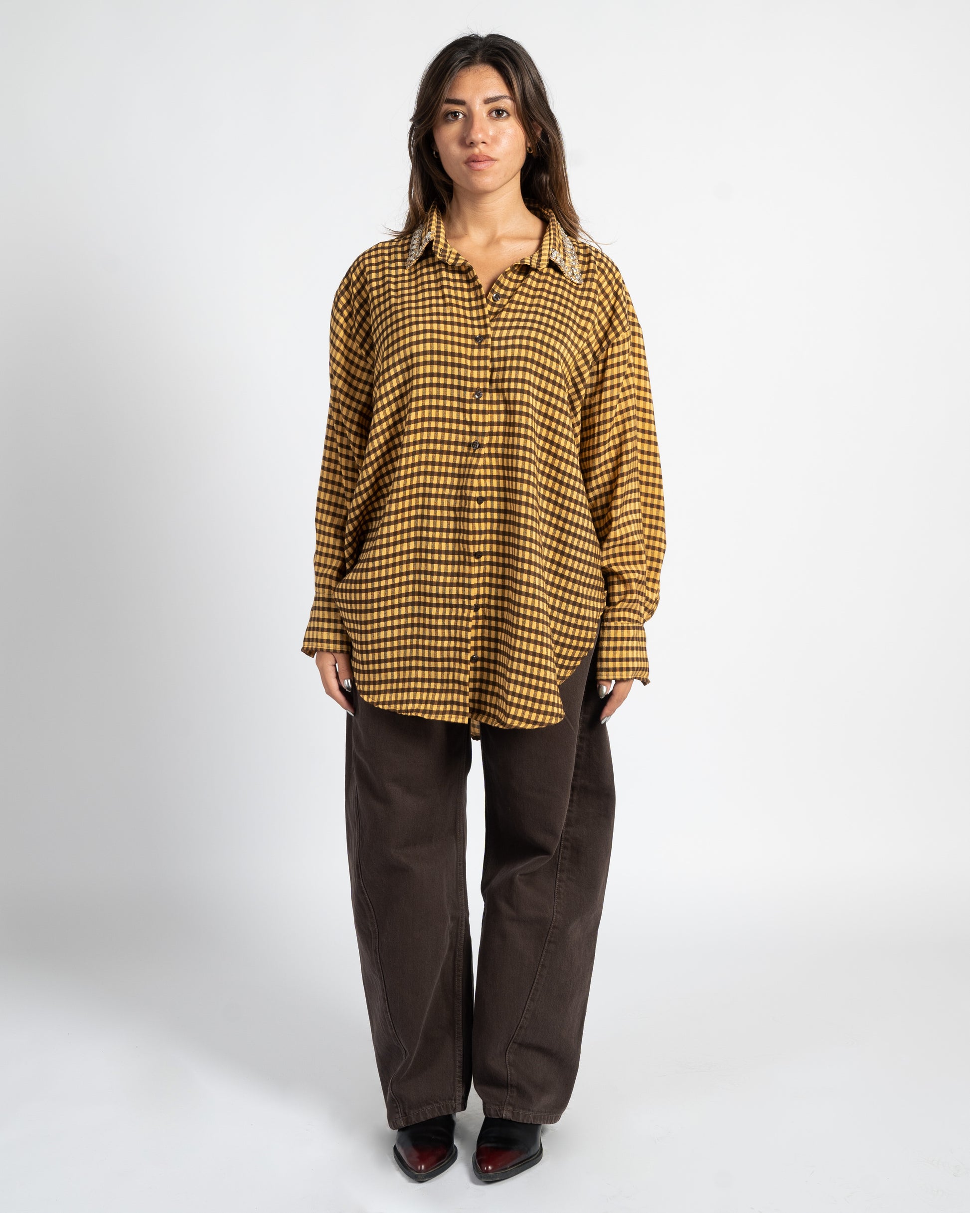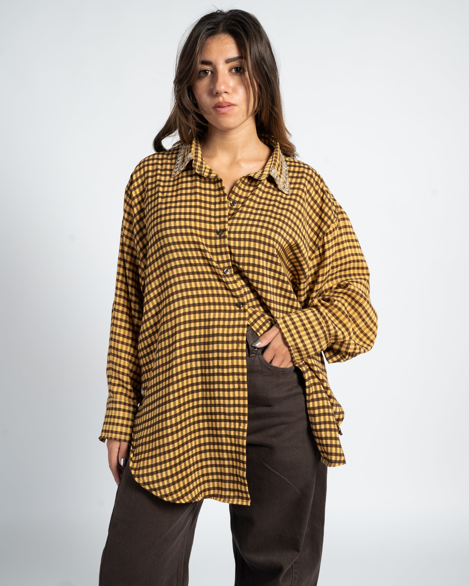 Effortlessly transition from day to night with the After Hours Shirt — your go-to piece for elevated everyday style. Crafted from 100% breathable cotton, this shirt features a relaxed oversized fit with elegantly curved sides for a flattering silhouette. A delicately embroidered collar adorned with hand-placed gems and beads, adding just the right touch of sparkle for those after-hours moments.