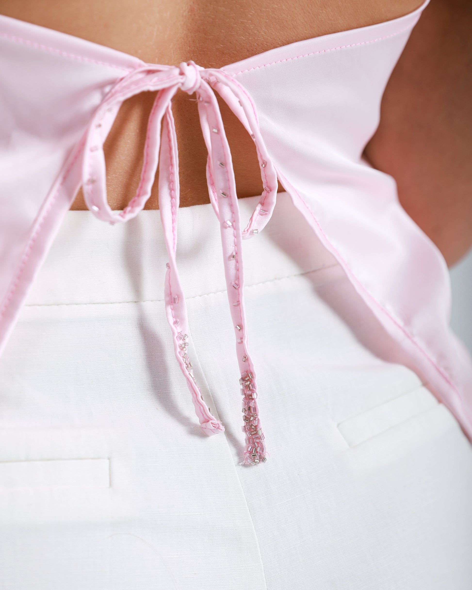 A soft satin piece in a romantic powder pink. The high neckline is elevated with a collar adorned in hand-placed beads, offering subtle sparkle and refined drama. A summer essential that’s both graceful and bold — true to the Tinfoil Butterfly spirit.