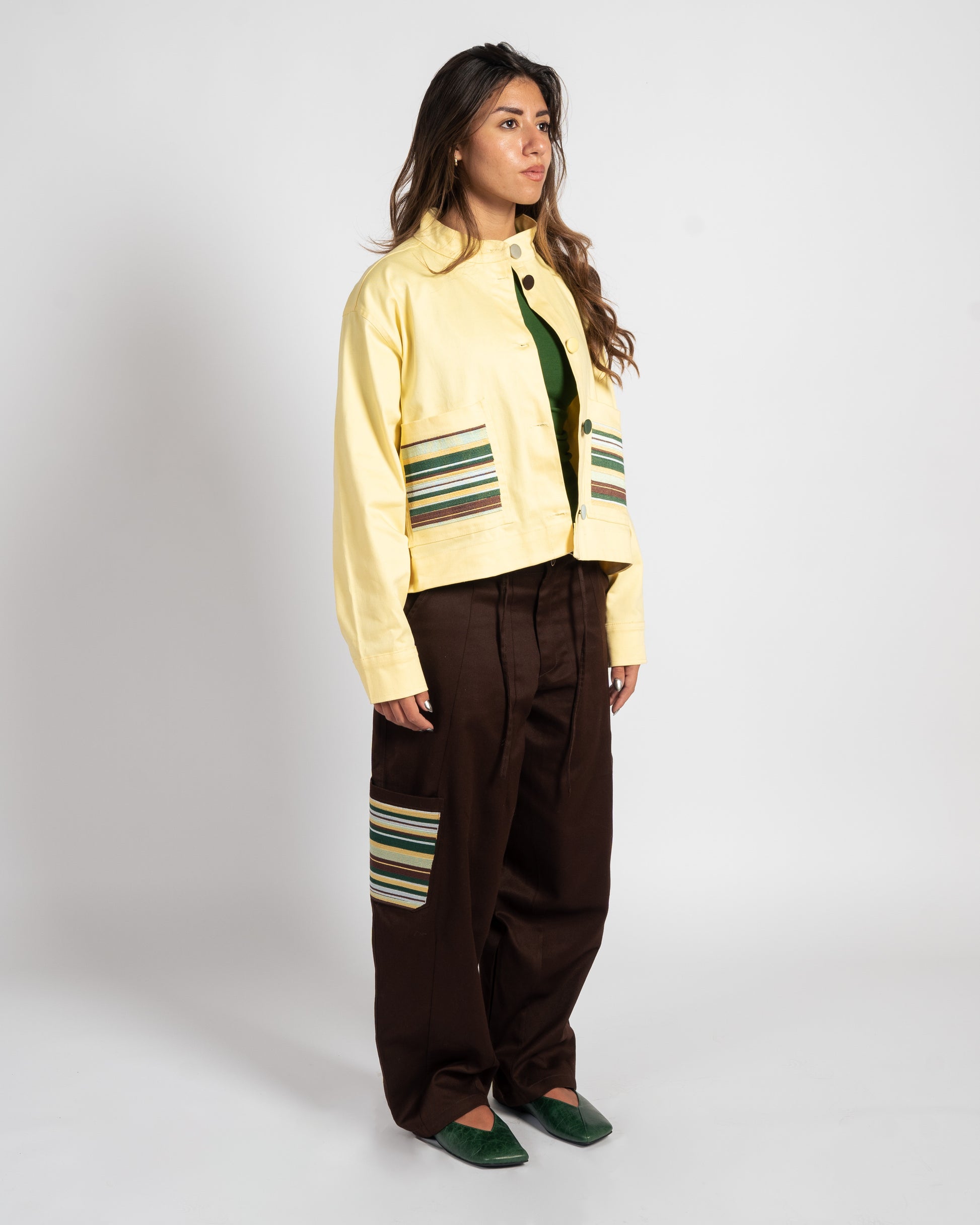 The Canyon Stripe Pants are crafted from structured gabardine fabric, designed to hold their shape while allowing comfortable movement. Cut in a relaxed barrel-leg silhouette, they offer volume through the leg with a softly tapered finish.