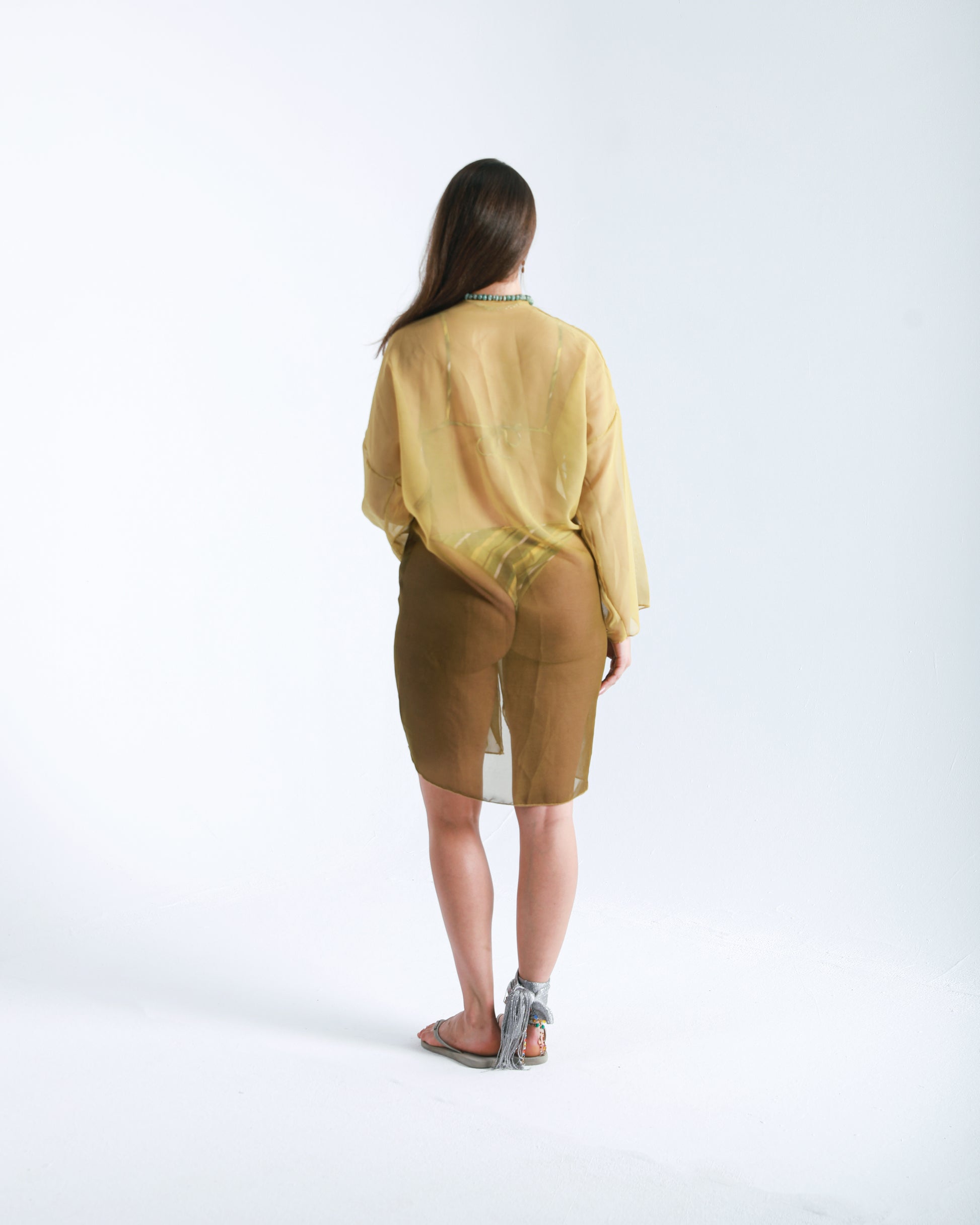 Hand-embroidered sequins and beads scatter across the fabric, catching the light from every angle. Ideal for layering over swimwear or a bold evening look.