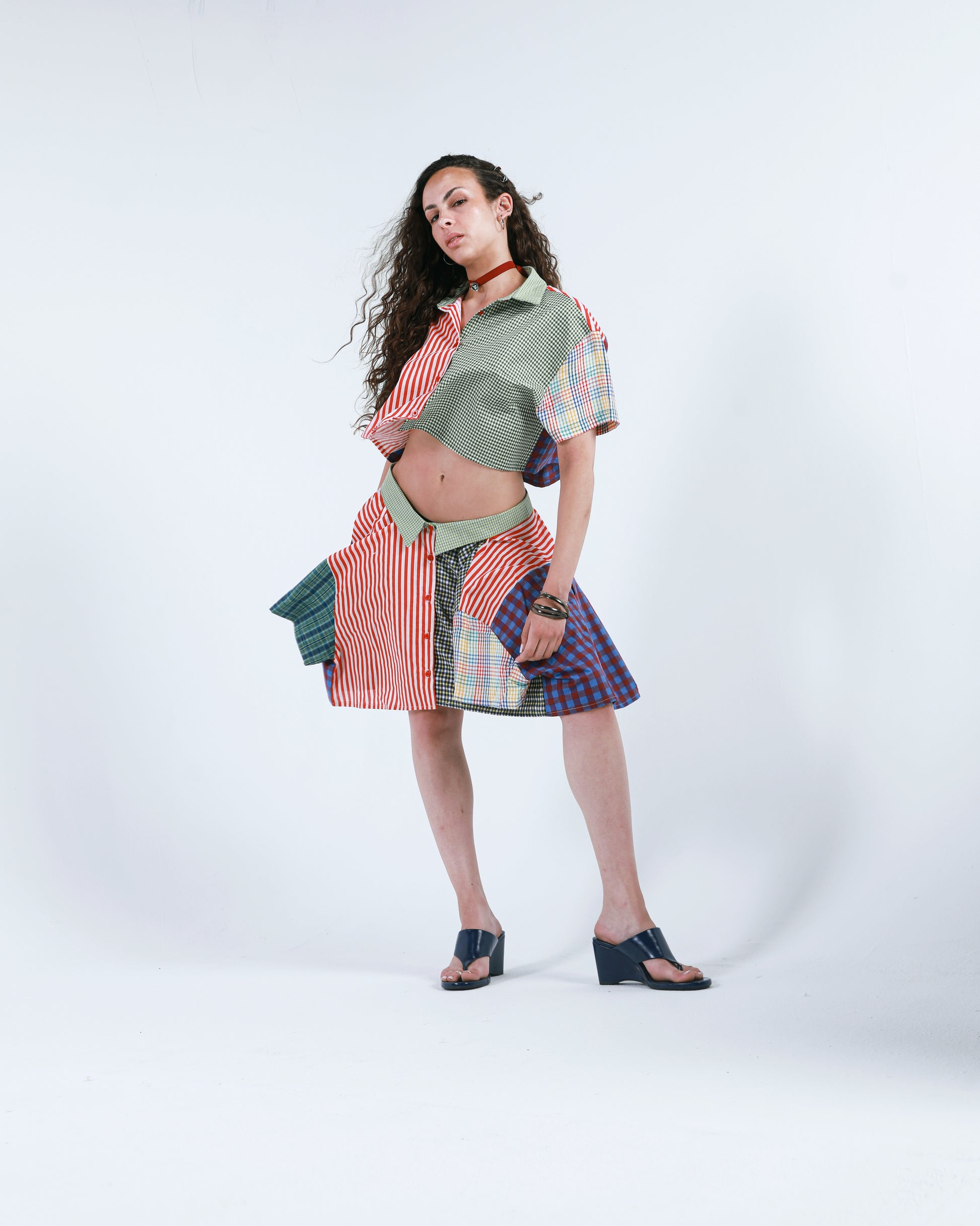 Two classic button-down shirts, reimagined into one bold statement piece. This skirt is a wearable mosaic of vibrant fabric panels, the relaxed silhouette makes it effortlessly cool for everyday styling.