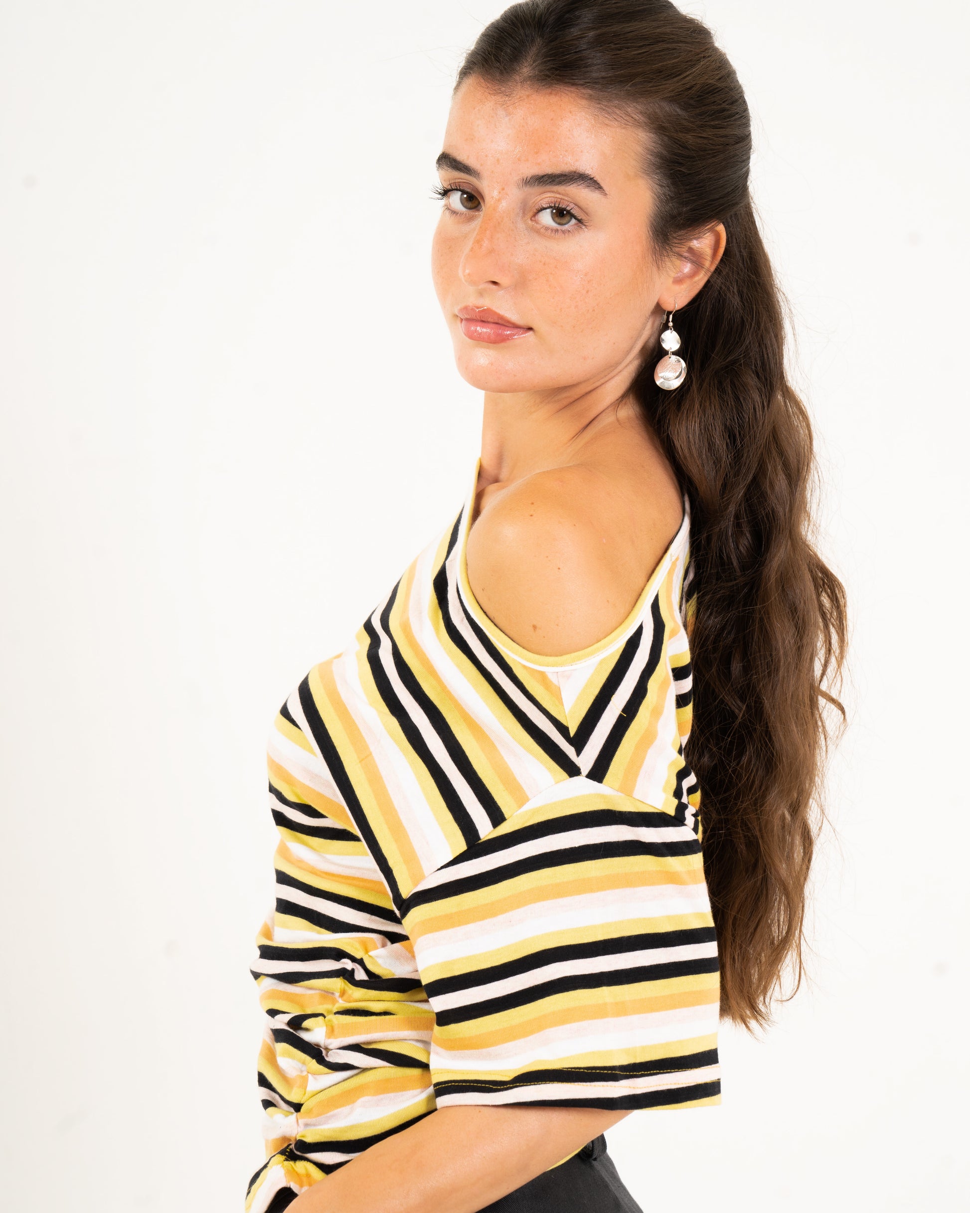 Bold stripes, effortless shape. This cotton top plays with contrast through shades of yellow, orange, white, and black. A dropped sleeve slips off one shoulder, while side ruching pulls the fabric into an asymmetrical hem.