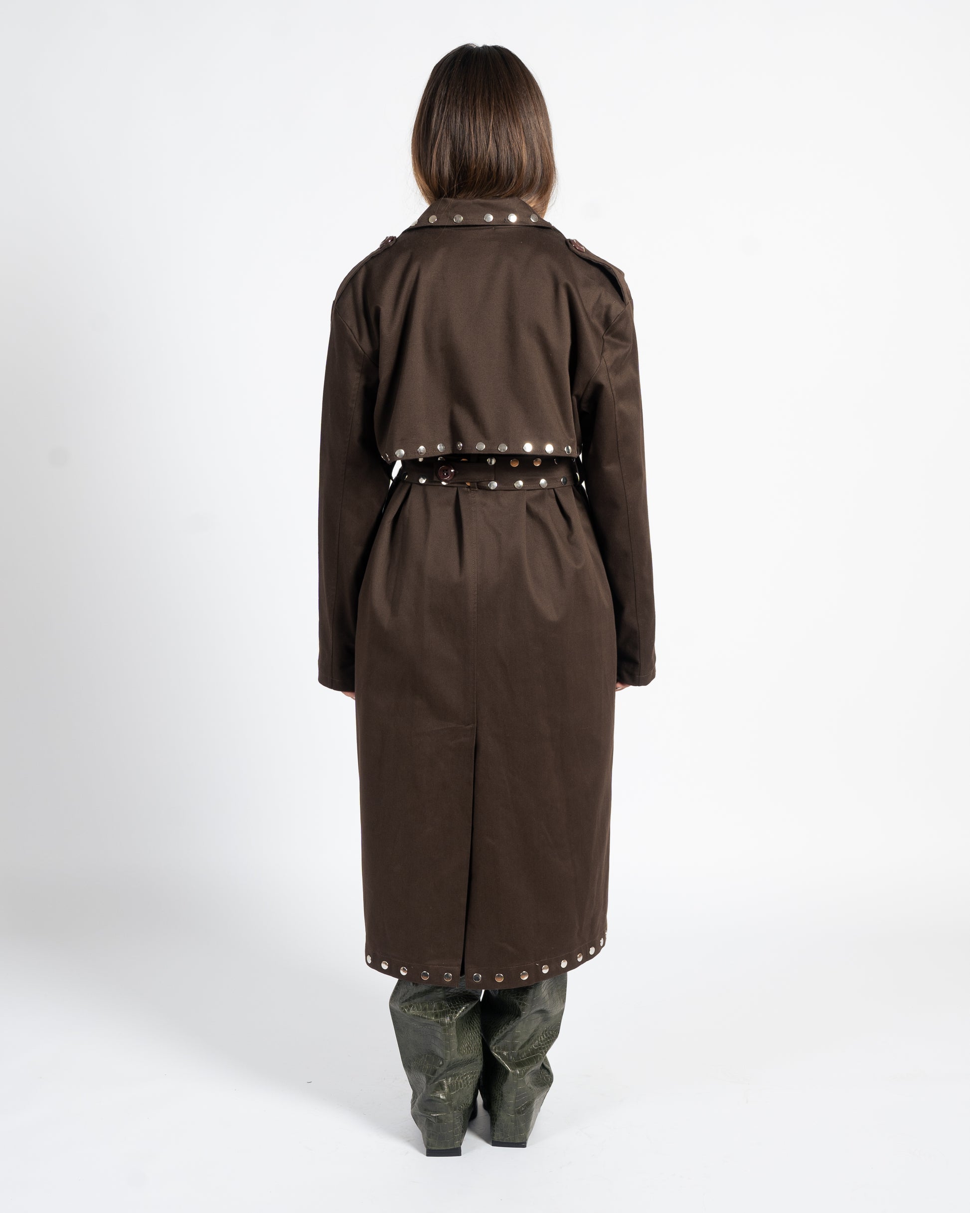 Metallic stud embellishments trace the lapels, belt, pockets, and hemline, giving the trench a sharp, modern edge. The double-breasted silhouette is finished with a self-tie belt, secured at the back with a discreet belt loop to keep it perfectly in place while wearing.