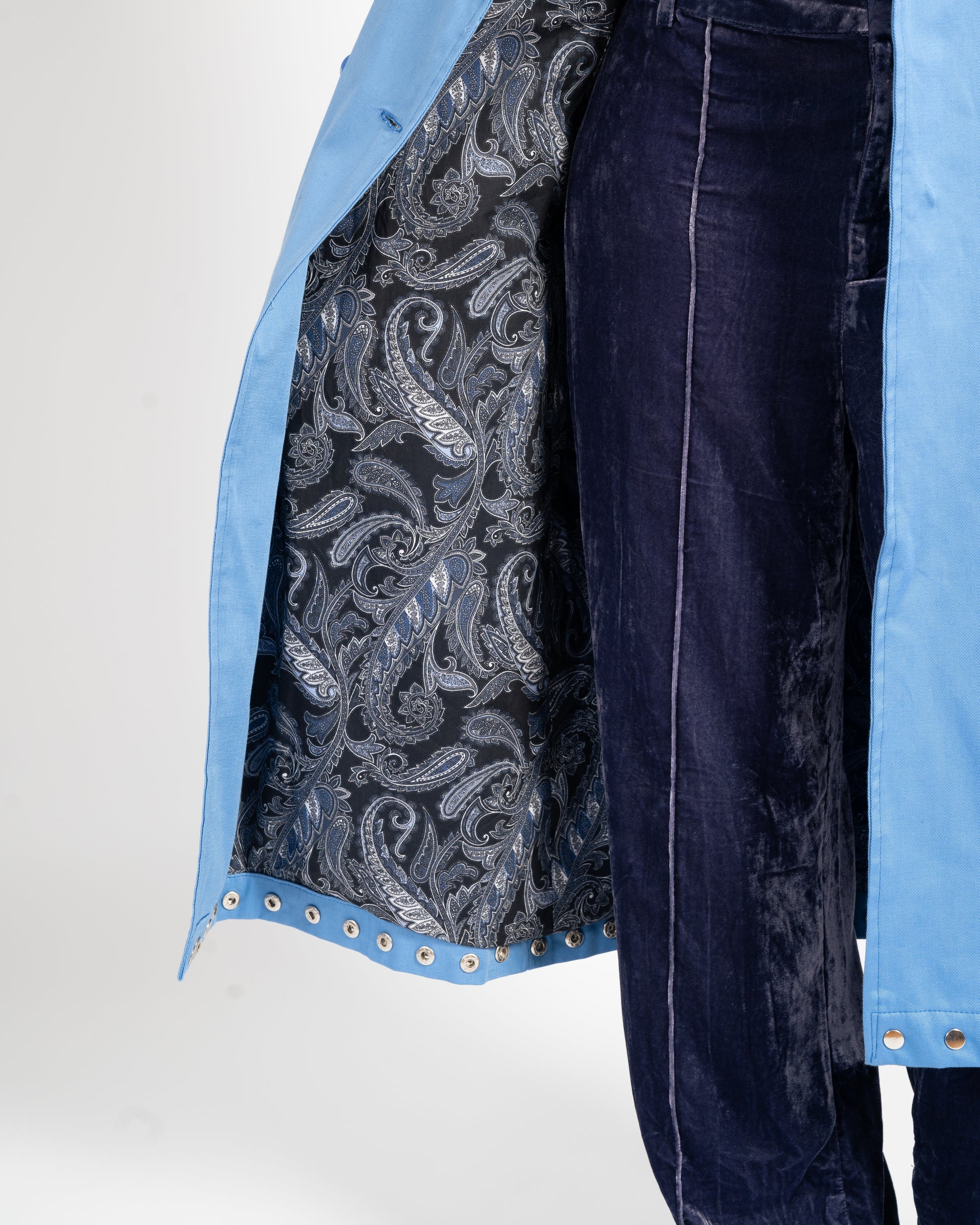 A bold reimagining of the classic trench. Crafted from structured gabardine fabric, designed for durability and a polished finish. The interior is fully lined with a contrasting paisley-print cotton, adding an unexpected layer of detail.