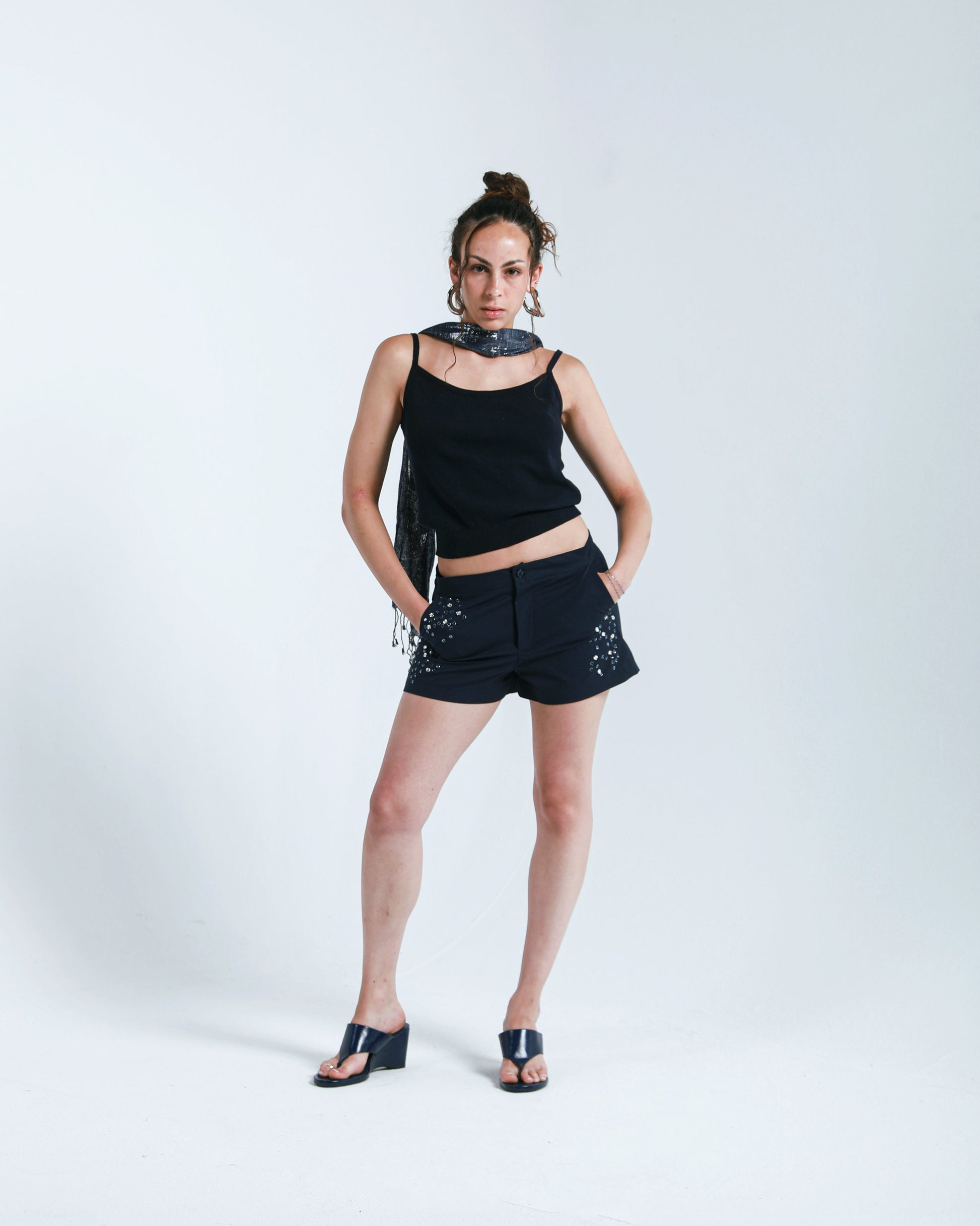 Make a statement with the Starry Night Shorts. Designed with a flattering silhouette, these shorts feature intricate hand embroidery with gems and sequins that shimmer subtly with every step.